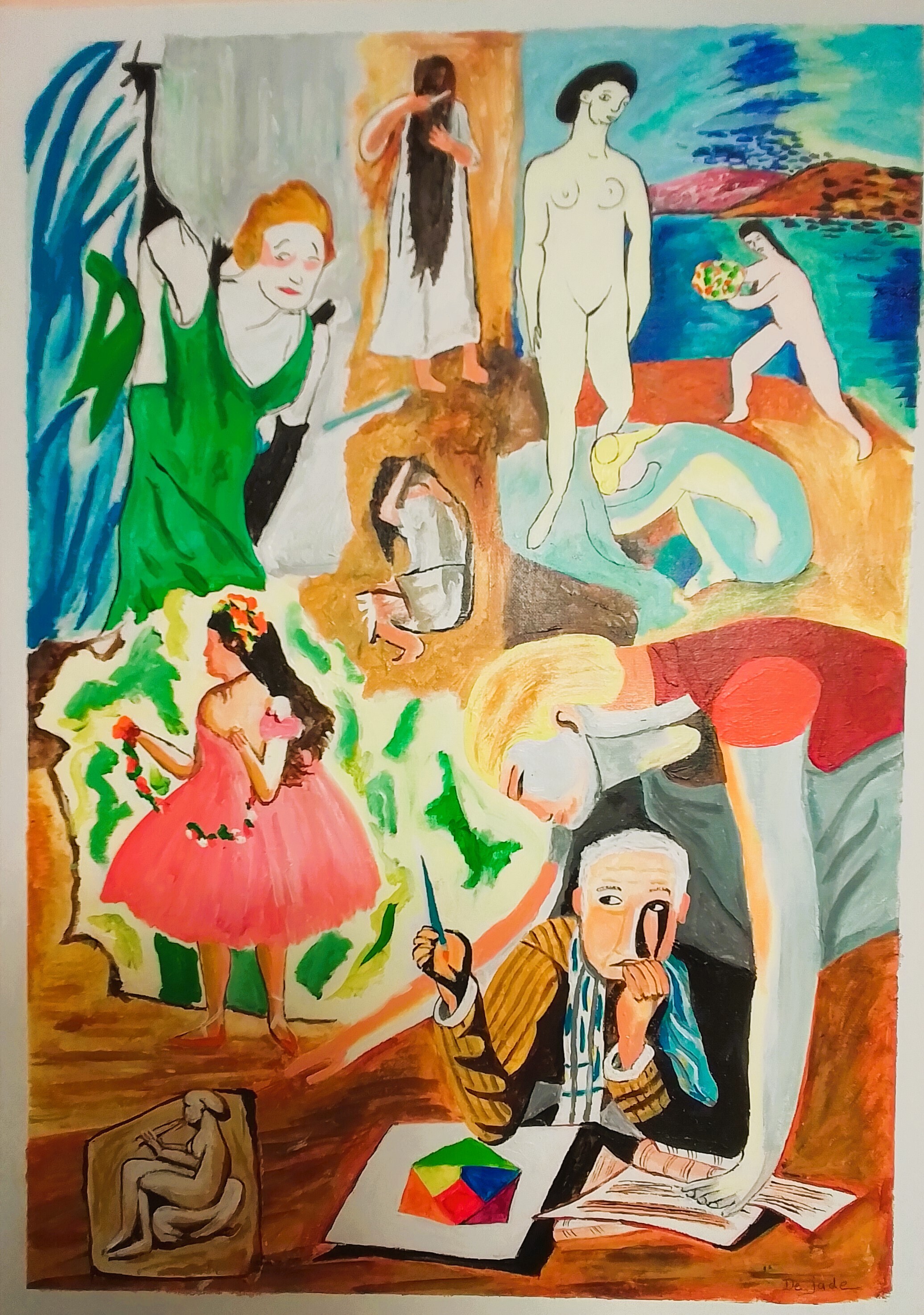 C’est à Alain Poujade de l’EHPAD Les Floralies à Nice qui s’est vu décerné le premier prix de ce concours. Cet octogénaire - qui se dit être « un artiste sur la vieillesse » - se découvre une véritable passion pour l’art après avoir fait carrière dans l'aviation. Son tableau est un composition riche et originale qui combine autoportrait, hommage à sa femme disparue et références à des œuvres célèbres telles que la danseuse d’Edgar Degas et les baigneuses de Henri matisse. Le jury a salué « l’audace et la cohérence » de l’œuvre, ainsi que sa qualité esthétique.